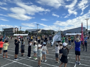 テントで待機していた皆さんも加わり、グラウンドに集まった全員でラジオ体操を行いました。その後の競技に向けて、心と体をしっかり整えます。