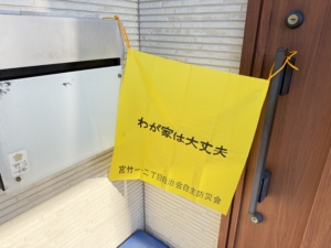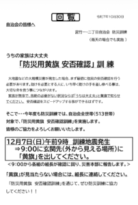 午前9時の訓練警報に合わせ、各世帯が黄旗を掲出しました。その後、各組長が巡回し、目視による安否確認を行いました。