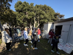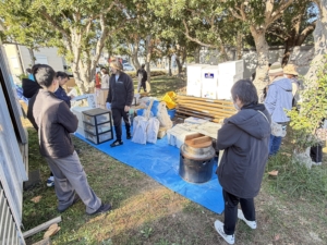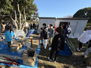 公民館では、参加者に配布する防災備蓄品として、アルファ米・ビスケット・トイレットペーパー・お茶の仕分け作業を行いました。参加者同士が協力し、準備を進めました。