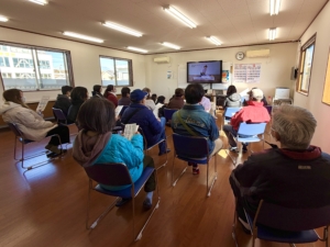 防災資器材の点検終了後11時すぎから、AED取り扱い説明動画の視聴会を2班に分けて行いました