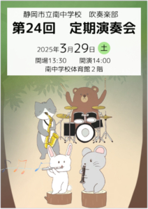 南中学 吹奏楽部 第24回定期演奏会2025年3月15日静岡市立南中学校 吹奏楽部 第24回 定期演奏会のご案内 南中学校吹奏楽部による「第24回定期演奏会」を開催いたします。 日頃の練習の成果を発表する特別な演奏会です。地域の皆さまに楽しんでいただけるよう、心を込めて演奏します。 ぜひお誘い合わせのうえ、ご来場ください! ◆ 開催概要 日程:2025年3月29日(土) 開場:13:30 開演:14:00 会場:南中学校 体育館 2階 入場無料・予約不要です。 皆さまのご来場を心よりお待ちしております! お知らせ